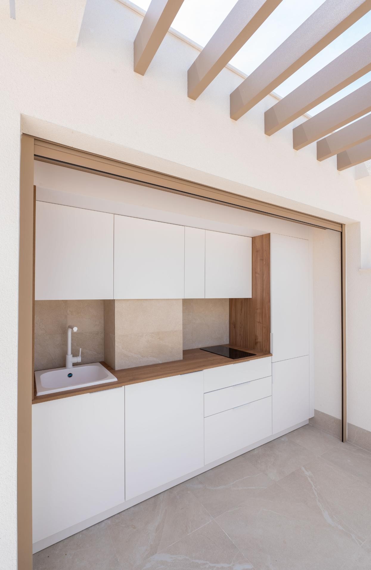 These new townhouses for sale in Los Alcázares, with prices starting from €439,000, offer a modern and comfortable lifestyle just a short distance from both the beach and the golf course, making them an excellent choice for anyone looking to buy property on the Costa Cálida. Each home features contemporary architecture, bright interiors, and high‑quality finishes, creating a stylish environment ideal for permanent living, holiday use, or investment. The layout includes three spacious bedrooms and two elegant bathrooms, along with an open‑plan living area that connects seamlessly to the outdoor spaces. Large windows fill the home with natural light, enhancing the sense of space and comfort.
